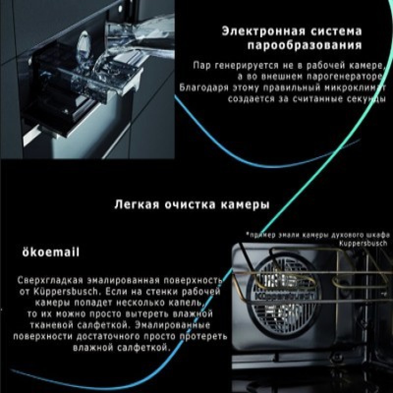 Компактный духовой шкаф с паром Kuppersbusch CBD 6550.0  Объем: 43 литра TFT-дисплей шириной 3,9" с текстовым и графическим полями 14 режимов духового шкафа  8 специальных режимов  6 режимов приготовления на пару 9 специальных режимов приготовления на пару  Более 40 автоматических программ 20 избранных программ для сохранения индивидуальных настроек Электронная система управления с сенсорными кнопками Отображение фактической температуры и рекомендуемой Электронный таймер (продолжительность программы, окончание, таймер обратного отсчета) с белыми индикаторами Съемная дверца с полностью стеклянной внутренней поверхностью Четырехслойное остекление дверцы Быстрый разогрев Экономичный режим Демо-режим Режим ожидания Галогенная подсветка Контактный дверной выключатель  Катализатор Okoterm очищает воздух во время приготовления, таким образом стенки духового шкафа всегда абсолютно чистые!  В отличие от энергоёмкой технологии пиролиза (разрушение частиц грязи путём дожигания) при температуре около 500°С, okotherm® не требует дополнительного времени и дополнительных затрат электроэнергии. Режимы работы Верхний и нижний нагрев Подача тепла сверху и снизу обеспечивает равномерное приготовление продуктов, расположенных на одном уровне. Прекрасно подходит для выпечки пирожных и пирогов, например, изделий из дрожжевого теста, чизкейков и т. д. Обдув горячим воздухом с Okotherm Вентилятор распределяет тепло, генерируемое кольцевым нагревательным элементом, который расположен на задней стенке рабочей камеры. Обеспечиваемая таким образом одинаковая температура по всему объему рабочей камеры гарантирует равномерное приготовление блюд на всех уровнях направляющих, не ухудшая их вкус и запах Верхний и нижний нагрев с обдувом горячим воздухом Тепло, генерируемое верхним и нижним нагревательными элементами, равномерно распределяется по объему рабочей камеры с помощью вентилятора. Прекрасно подходит для выпечки и жарения Режим "пицца" с Okotherm Сочетание нижнего нагрева и обдува горячим воздухом оптимально подходит для приготовления изделий в виде хрустящей основы с мягкой начинкой. Идеально для пиццы, печенья или выпечки с начинкой из фруктов и паштетов Нижний нагрев Благодаря теплу, генерируемому только нижним нагревательным элементом, данный режим прекрасно подходит для приготовления изделий с хрустящей основой или для получения более коричневой корочки снизу. Прекрасно подходит для приготовления очень мягких фруктовых пирогов и для легкого запекания тестовой основы пирогов перед приготовлением Верхний нагрев Тепло, генерируемое верхним нагревательным элементом, прекрасно подходит для запекания и подрумянивания блюд ECO Режим ECO позволяет уменьшить энергопотребление при приготовлении блюд. Для снижения потребления электроэнергии, духовой шкаф автоматически отключается за несколько минут до окончания приготовления блюда, используя тепло, остающееся в рабочей камере, для доведения блюда до готовности Интенсивный обдув горячим воздухом с Okotherm Включенный верхний нагревательный элемент, помимо обдува горячим воздухом, используется для создания хрустящей корочки и подрумянивания блюда. Прекрасно подходит для приготовления запеченного картофеля, жарения или запекания Гриль + нижний нагрев Тепло от нижнего нагревательного элемента 