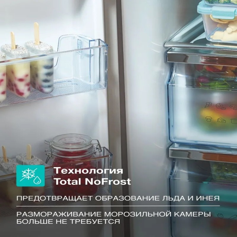 Без утомительного размораживания. Одна из лучших систем охлаждения на рынке, установленная в морозильной камере, предотвращает образование инея и льда. В результате вам не требуется размораживать морозильную камеру, и ее пространство можно использовать более эффективно. Упаковки продуктов не примерзают друг к другу, сохраняя порядок в морозильнике.
